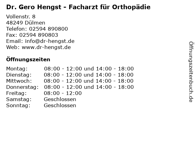 Gero Hengst Öffnungszeiten Montag. Web HENGST - Praxis für Orthopädie und Unfallchirurgie ORTHO Dr. HENGST MVZ GmbH has its registered office in Dülmen Germany.